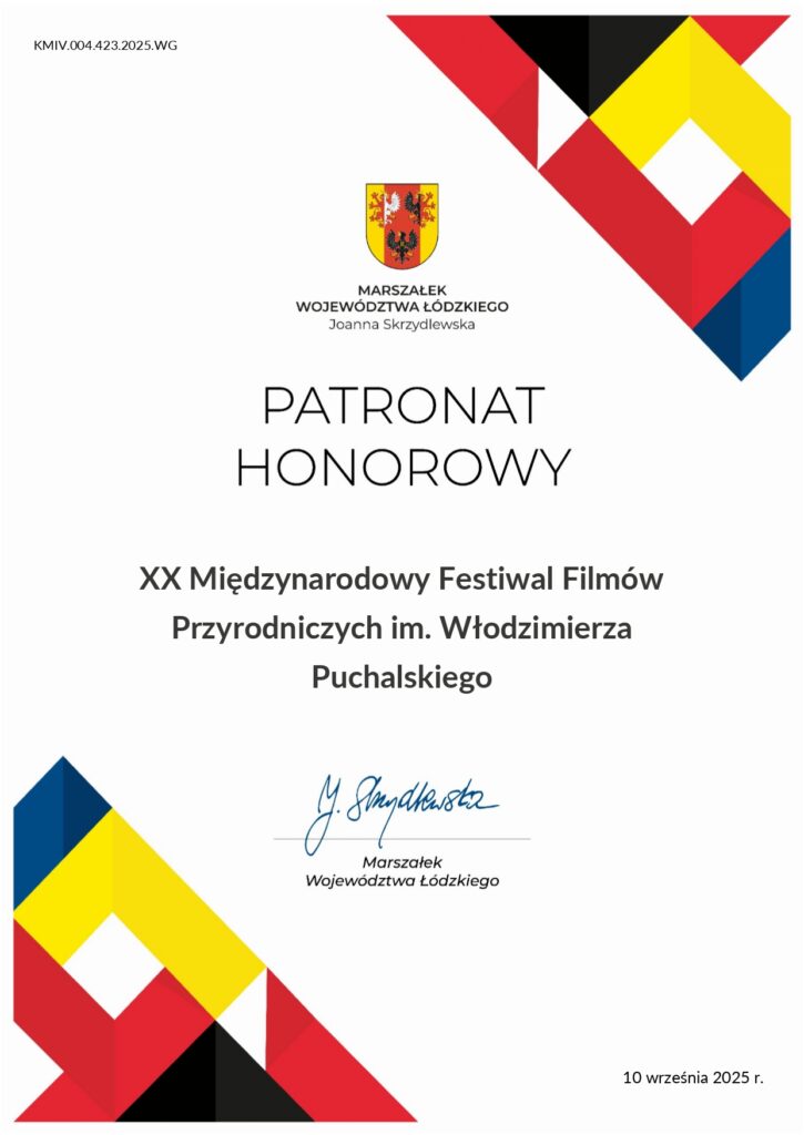 Z wielką dumą informujemy, że Marszałek Województwa Łódzkiego, Joanna Skrzydlewska, objęła patronatem honorowym XX Międzynarodowy Festiwal Filmów Przyrodniczych im. W. Puchalskiego.